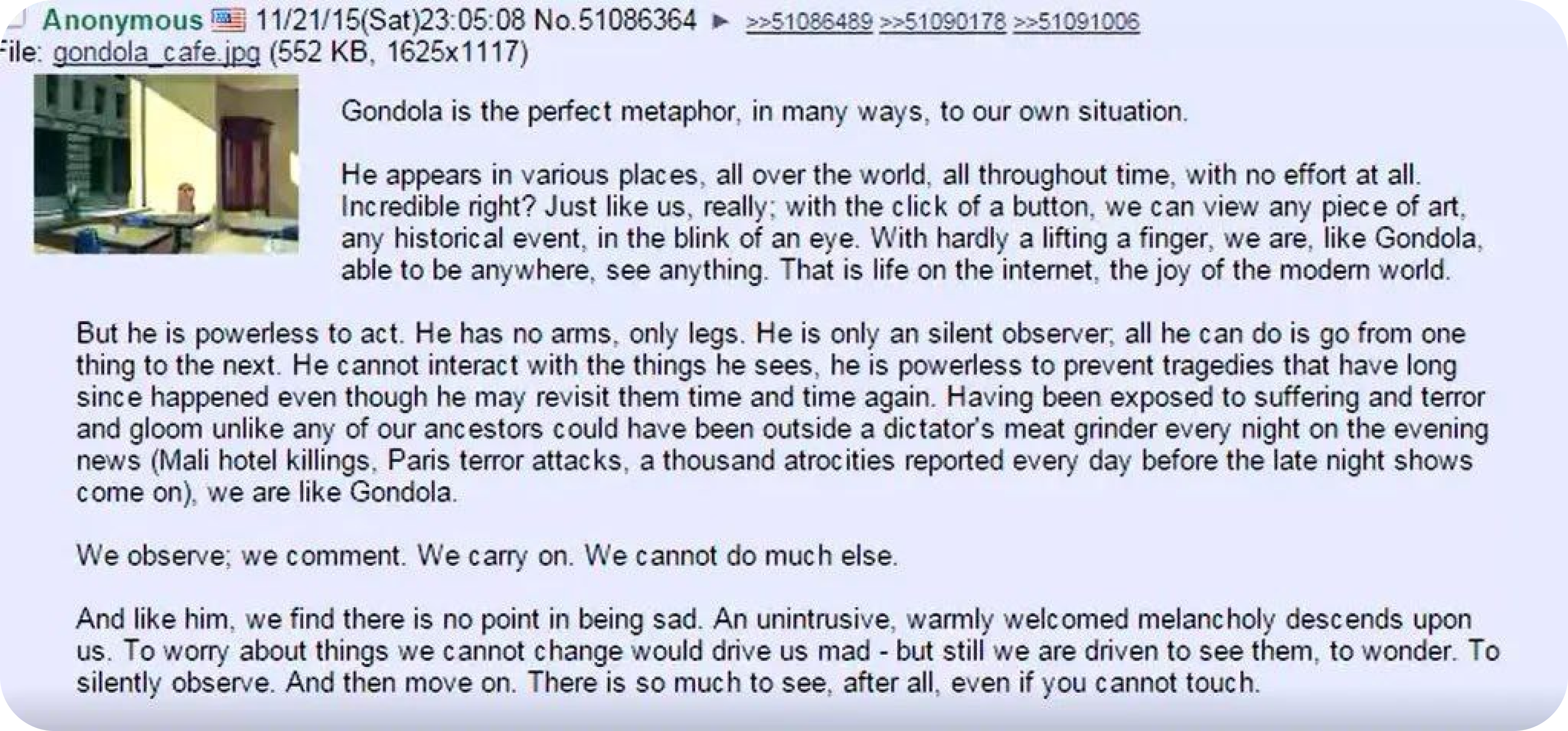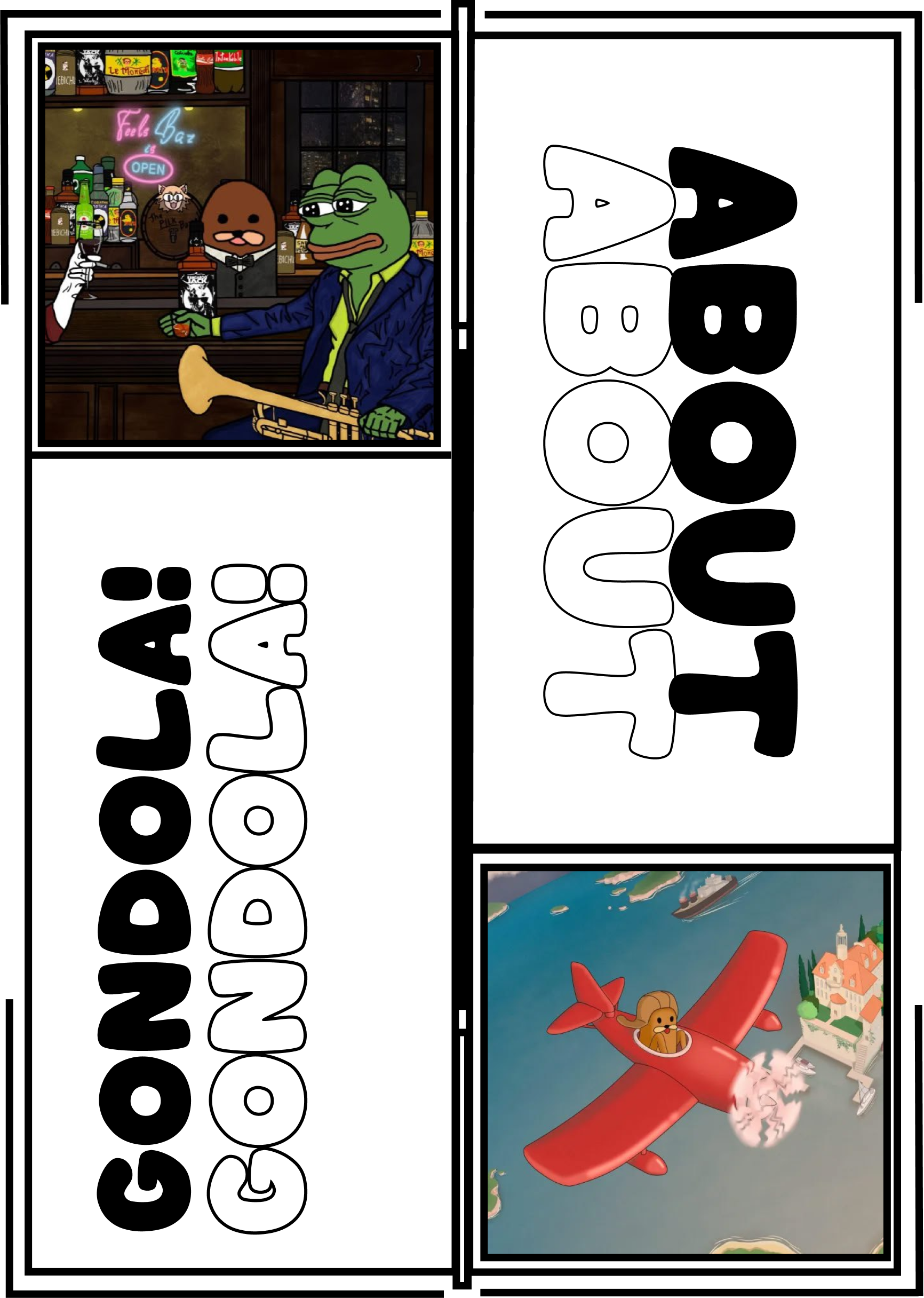 Gondolas are relaxed, harmless, and innocent creatures created by internet denizens searching for a thoughtful being to represent them. Known as ‘Silent Observers’, they rarely interfere or talk, preferring the calming silence of the environments they inhabit. Having no hands, they embody the Taoist principle of ‘Wu Wei’ (non-action), while their comforting expression shows their complete and utter acceptance of the world as it is. With over 10 years of original memes crafted by a cult community, GONDOLA stands as a symbol of peaceful contemplation, nature, and the inner nature of our world. Join us, and let's observe together Gondola’s journey.
